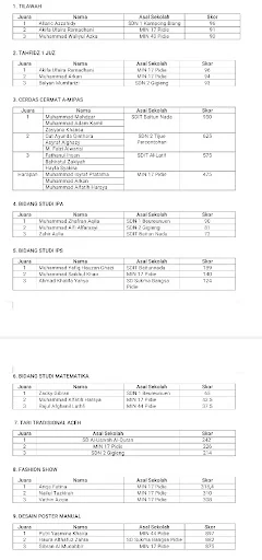 Beragam perlombaan itu antralain lomba tilawah, tahfiz, cerdas cermat, bidang studi IPA, IPS, matematika, tari tradisional Aceh, fashion show hingga lomba desain poster manual.